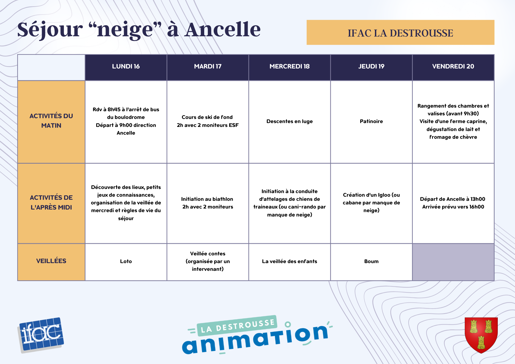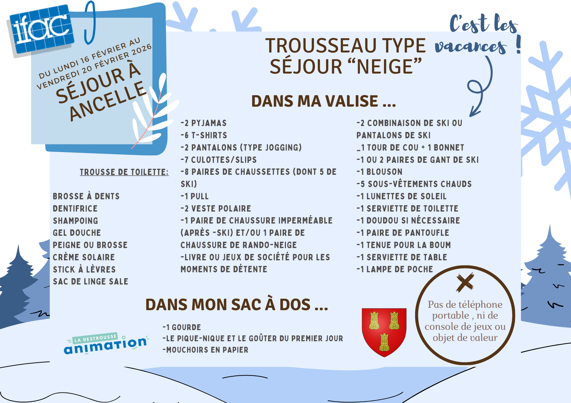 Accueil > Actualités > Séjour hiver 2026 Séjour hiver 2026 Événement Retrouvez ici les informations du séjour des vacances de février. Téléchargez les flyers et les trousseaux du séjour Flyer séjour Neige à ANCELLE Février 2026 Planning d'activités Trousseau Informations